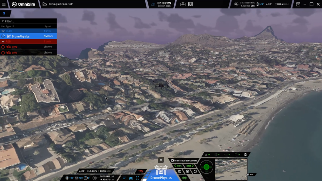 Omnisim supports high fidelity, physics based simulation for a wide range of platforms, including drones, ground vehicles and UAVs. You can connect real hardware or embedded software using hardware in the loop and software in the loop configurations to test timing, control and integration in a controlled environment. This allows you to validate algorithms and system performance early, reduce risk and shorten the path from lab to field.